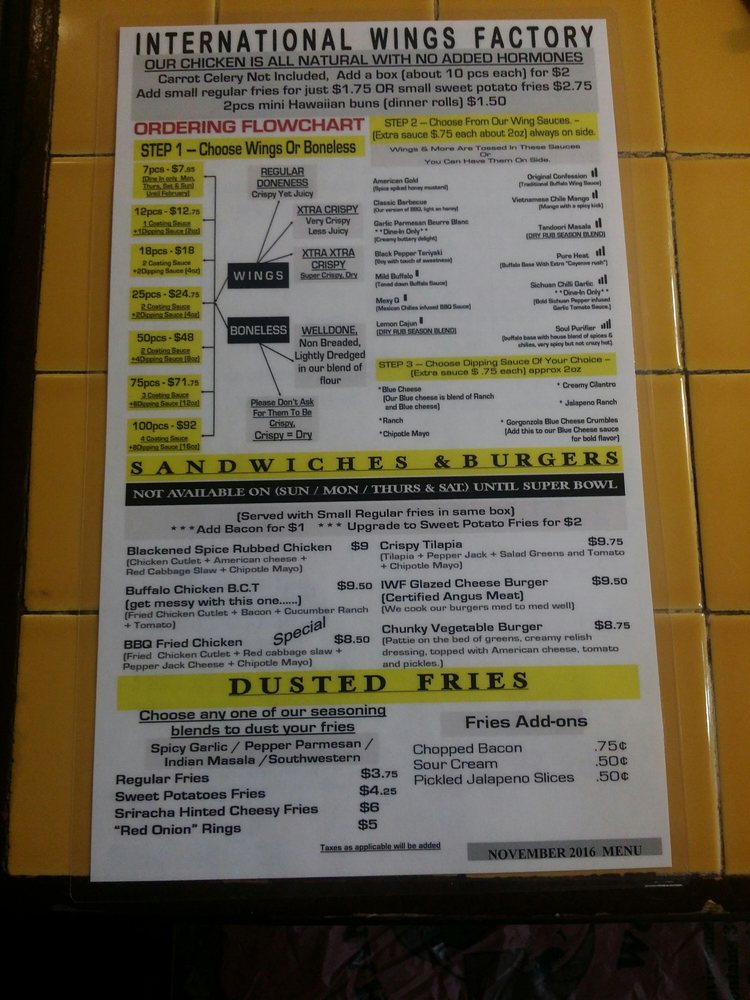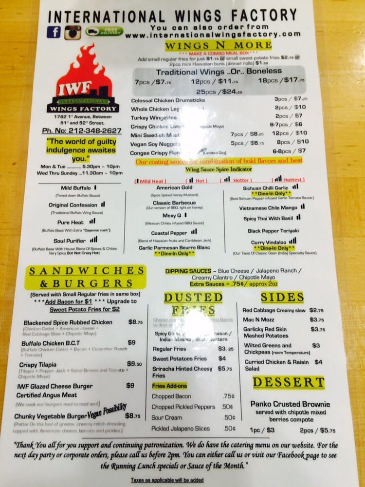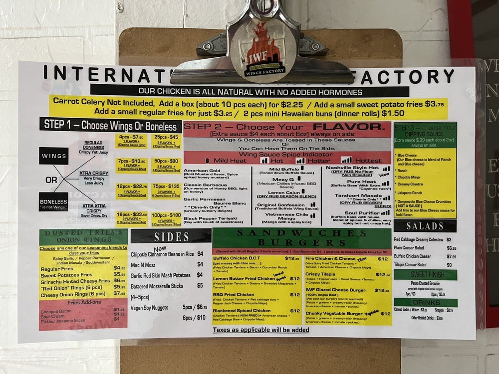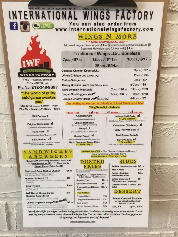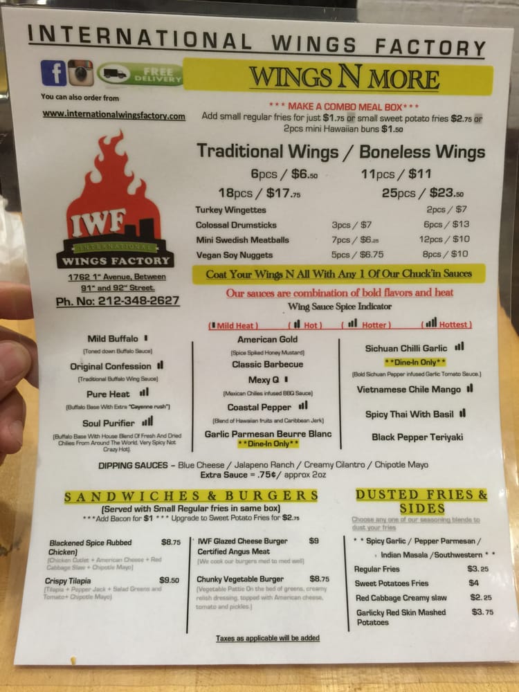 Introducing the menu at International Wings Factory, located in New York City, bring together a diverse selection of wings, salads, sandwiches, and burgers. With a focus on traditional wings, customers can choose from various quantities and flavors, accompanied by dipping sauces. The Buffalo Chicken BCT Sandwich and IWF Glazed Cheese Burger stand out as popular choices. Reviews rave about the flavorful wings and wide range of options available. The cozy spot offers delivery, takeout, and reservations, catering to various preferences like vegan and vegetarian options. The casual atmosphere and friendly staff make dining at International Wings Factory a delightful experience. If you're a fan of wings, this spot is a must-try in NYC.