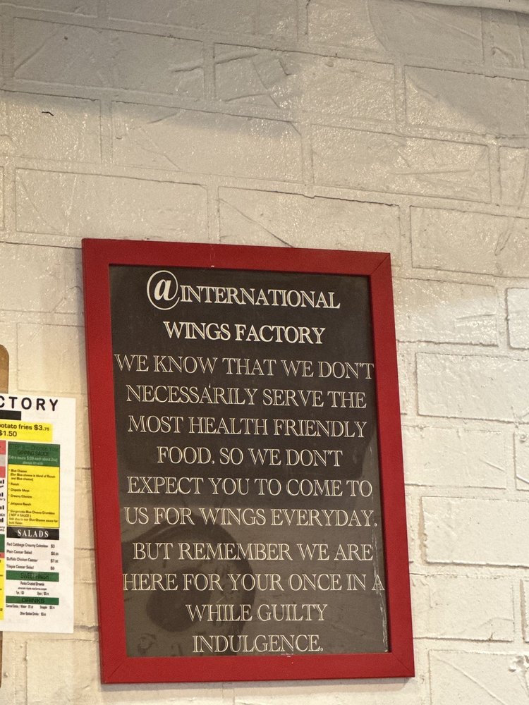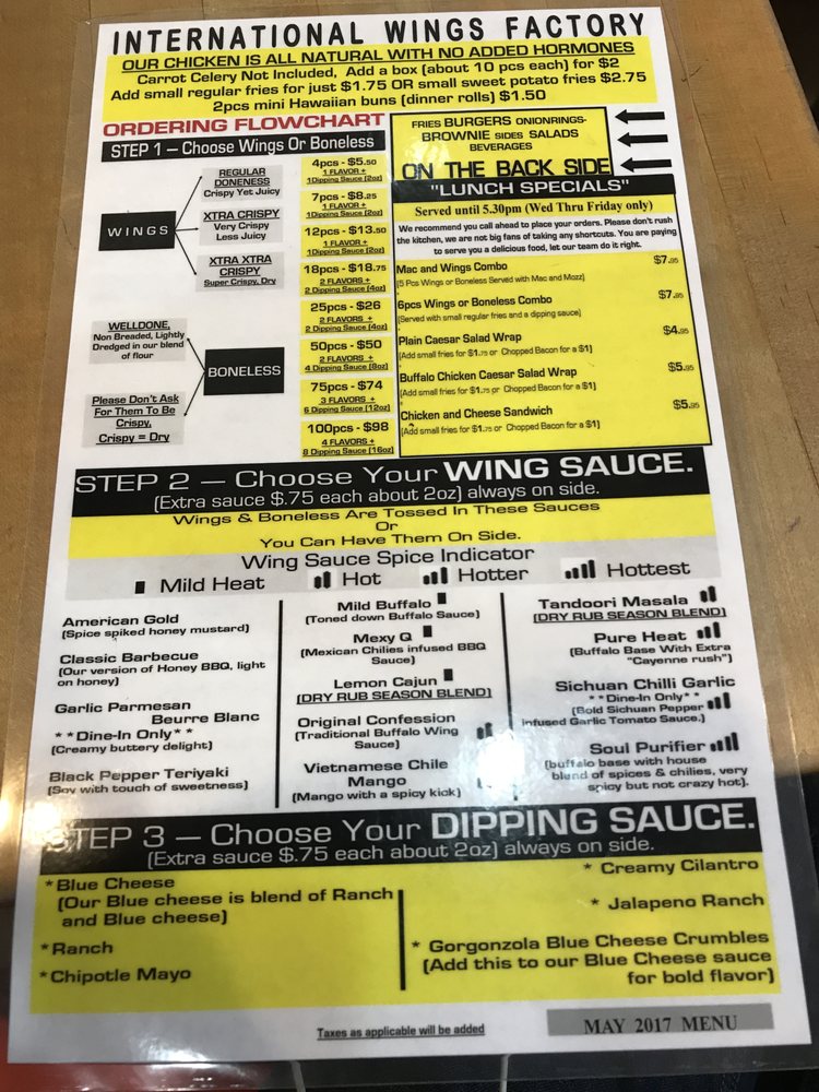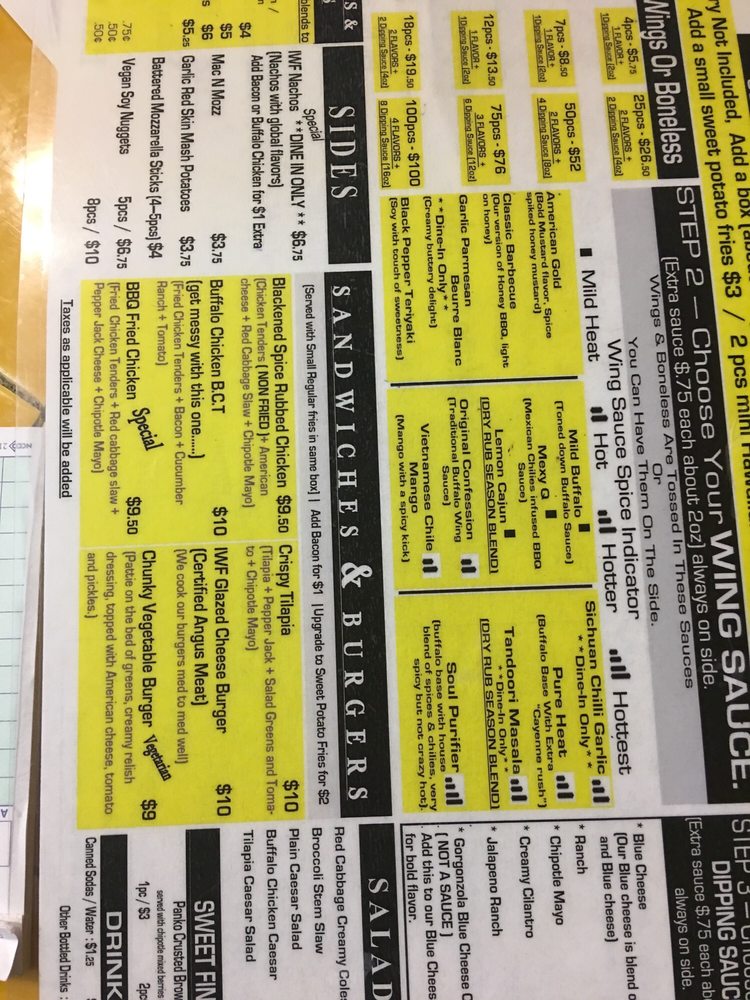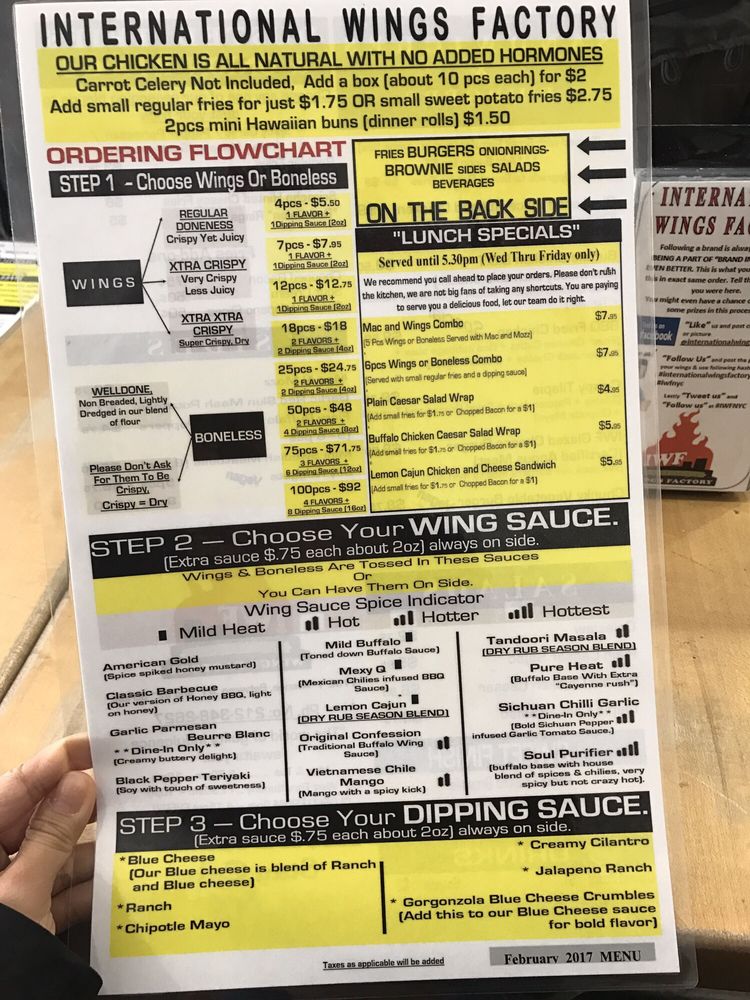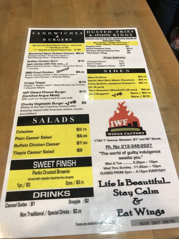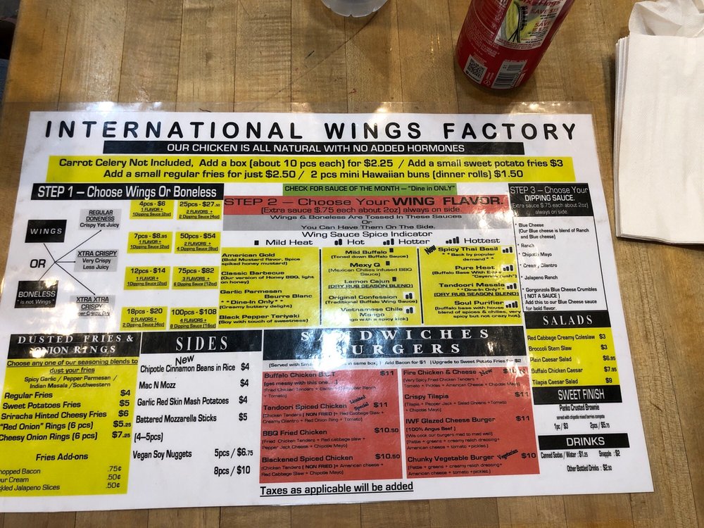 Introducing the menu at International Wings Factory, located in New York City, bring together a diverse selection of wings, salads, sandwiches, and burgers. With a focus on traditional wings, customers can choose from various quantities and flavors, accompanied by dipping sauces. The Buffalo Chicken BCT Sandwich and IWF Glazed Cheese Burger stand out as popular choices. Reviews rave about the flavorful wings and wide range of options available. The cozy spot offers delivery, takeout, and reservations, catering to various preferences like vegan and vegetarian options. The casual atmosphere and friendly staff make dining at International Wings Factory a delightful experience. If you're a fan of wings, this spot is a must-try in NYC.